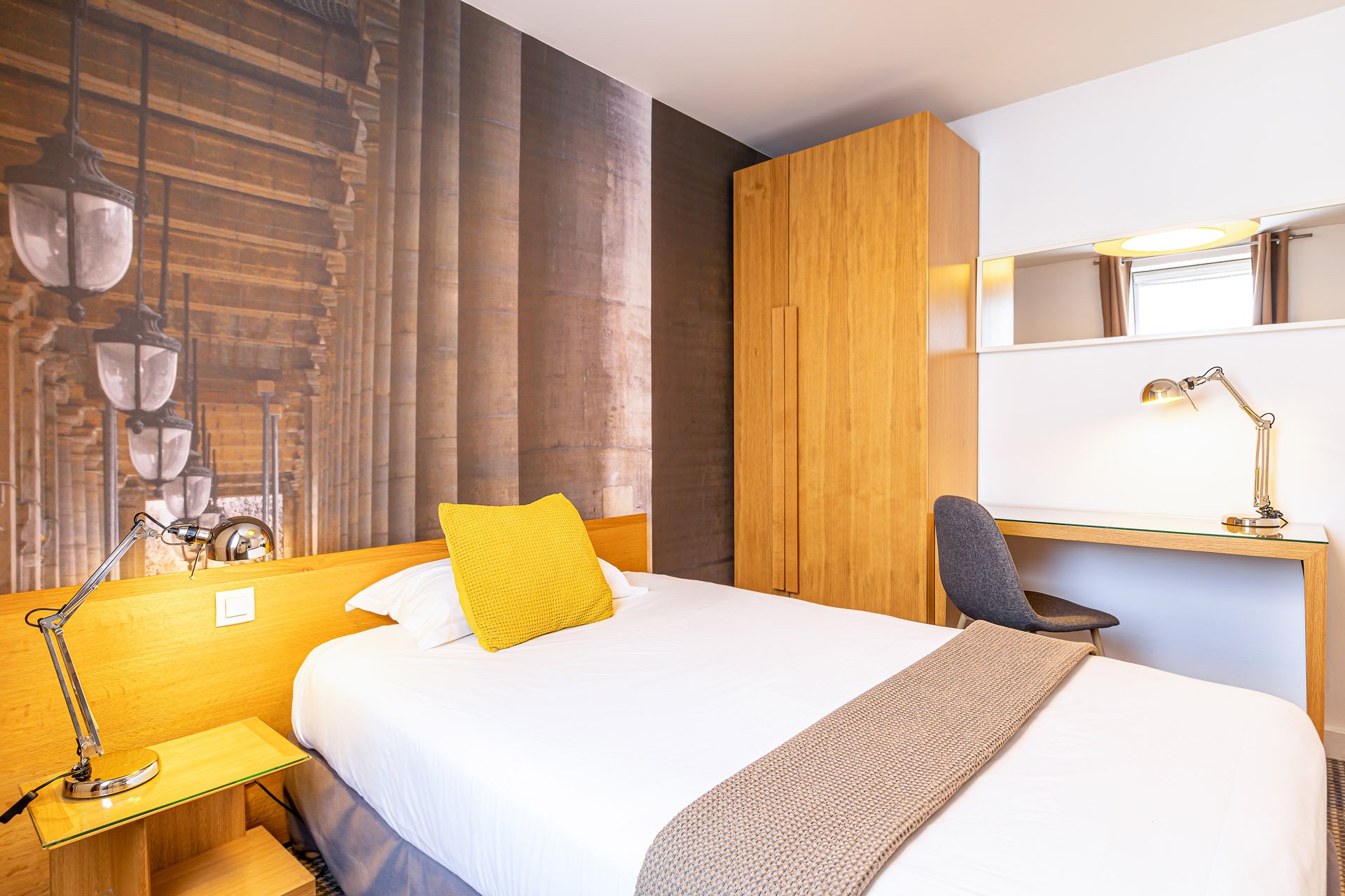 C’est un charme parisien et apaisant qui donne à l’ensemble des 32 chambres leur cachet. L'harmonie des couleurs chaudes dans les tons taupe, orange et gris, les moquettes épaisses et le clin d’œil à la capitale par la surprenante photographie de tête de lit dégagent une ambiance cosy et contemporaine. Sommeil et quiétude vous attendent à l’ombre des Invalides, de Notre-Dame, ou encore de l’intimidante mais non moins majestueuse Dame de Fer.